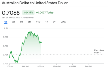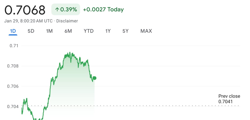 As of January 29, 2026, the Reserve Bank of Australia's published reference rate for AUD/USD is $0.7091, and the trade-weighted index stands at 65.2.